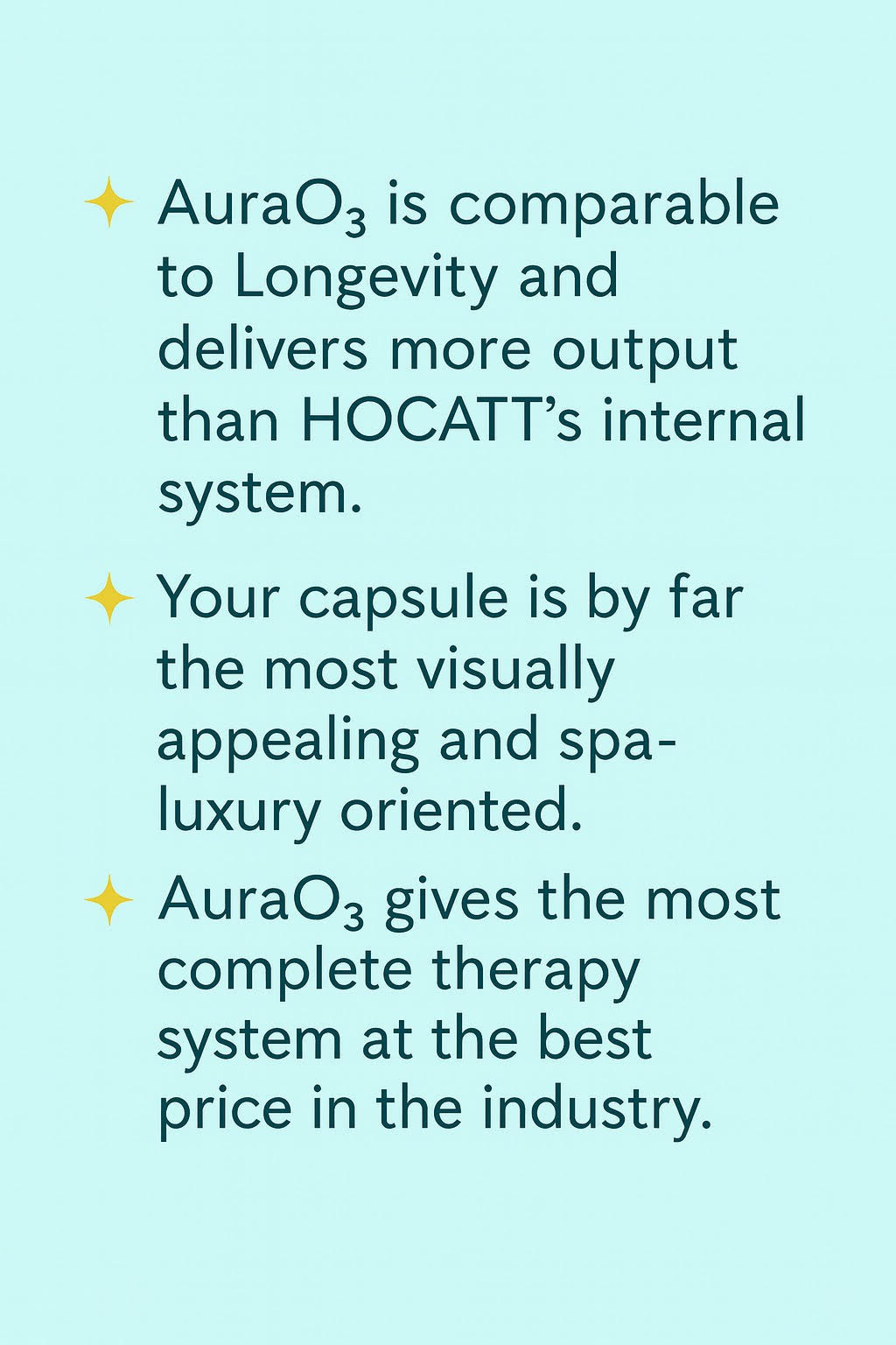 ✨ AuraO₃ delivers the most complete therapy system in the industry—combining ozone, steam, infrared heat, magnetic therapy, and oxygen-rich EWOT at the best price point available.